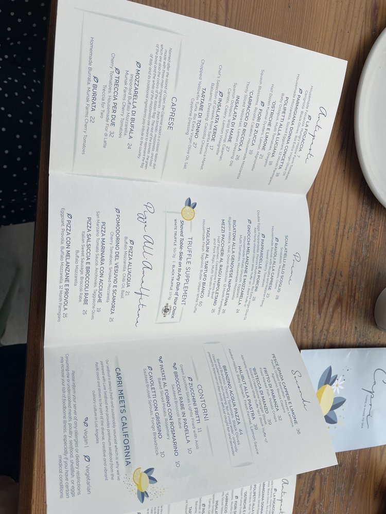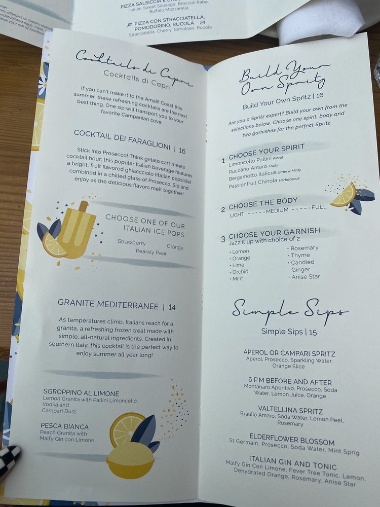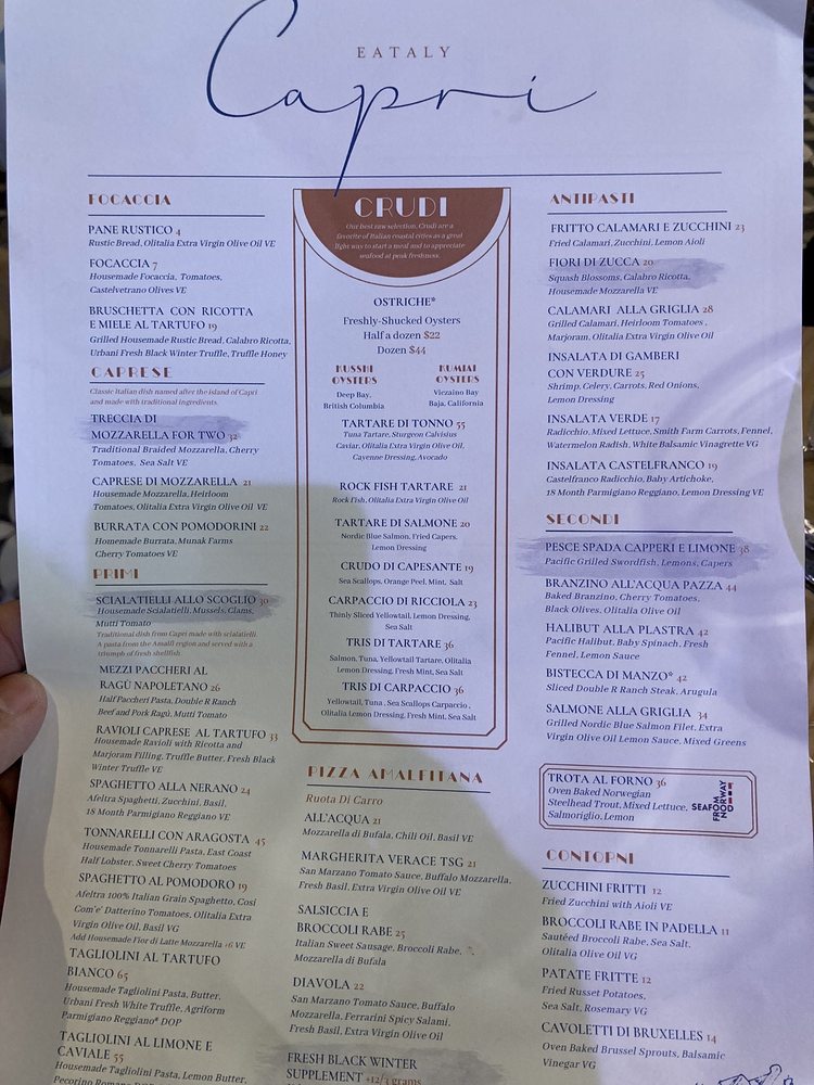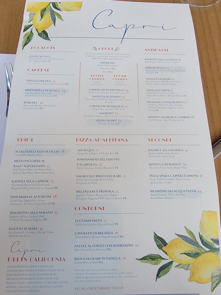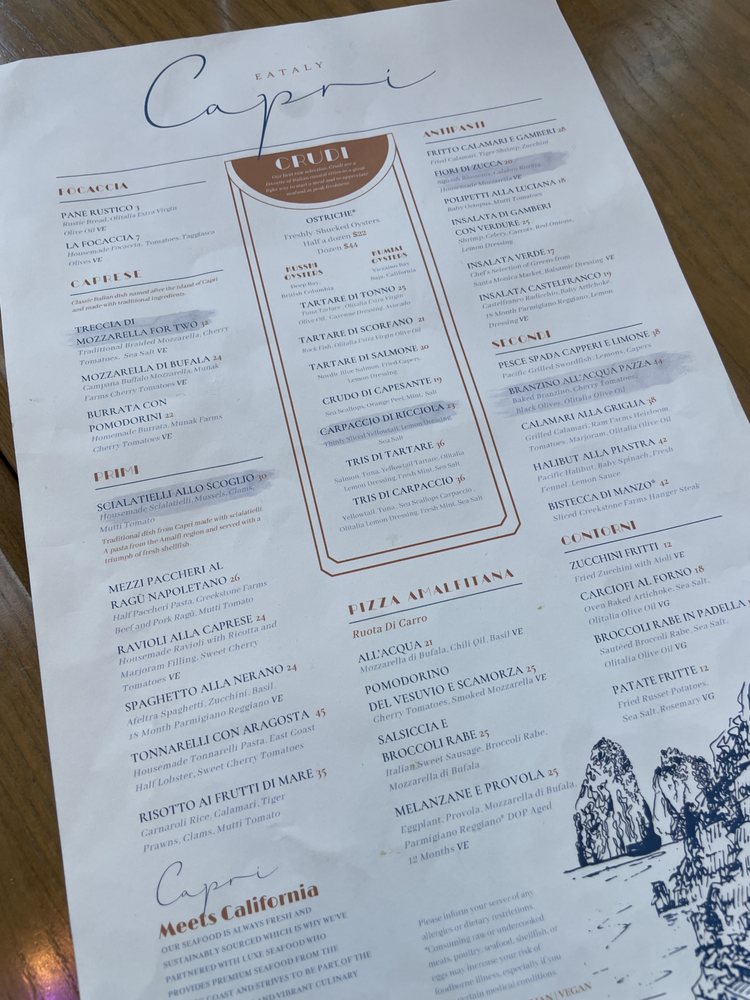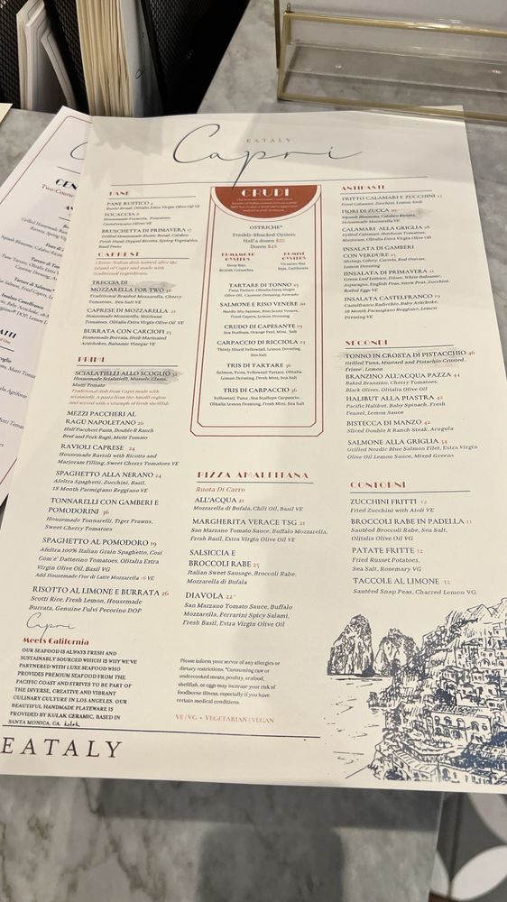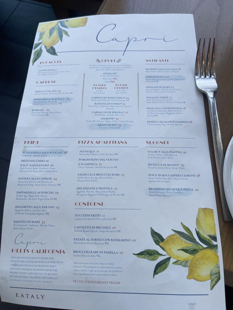 Capri at Eataly Los Angeles offers a vibrant seafood and Italian cuisine experience, with a focus on expertly crafted cocktails. Located at 10250 Santa Monica Blvd in Los Angeles, this trendy establishment provides a casual yet stylish setting for diners. Customers rave about the knowledgeable and personable bartender, JR, who serves up delicious off-menu cocktails. The menu features dishes like Spaghetti Nerano and Fiori Di Zucca stuffed with ricotta cheese, which have received positive reviews. The option for family-style dining allows guests to sample a variety of dishes. While prices may lean towards the higher end, the quality of the food justifies the cost. Make sure to check out their happy hour specials for a great deal on appetizers and drinks. Overall, Capri at Eataly Los Angeles is a must-visit for seafood and Italian cuisine enthusiasts looking for a memorable dining experience.